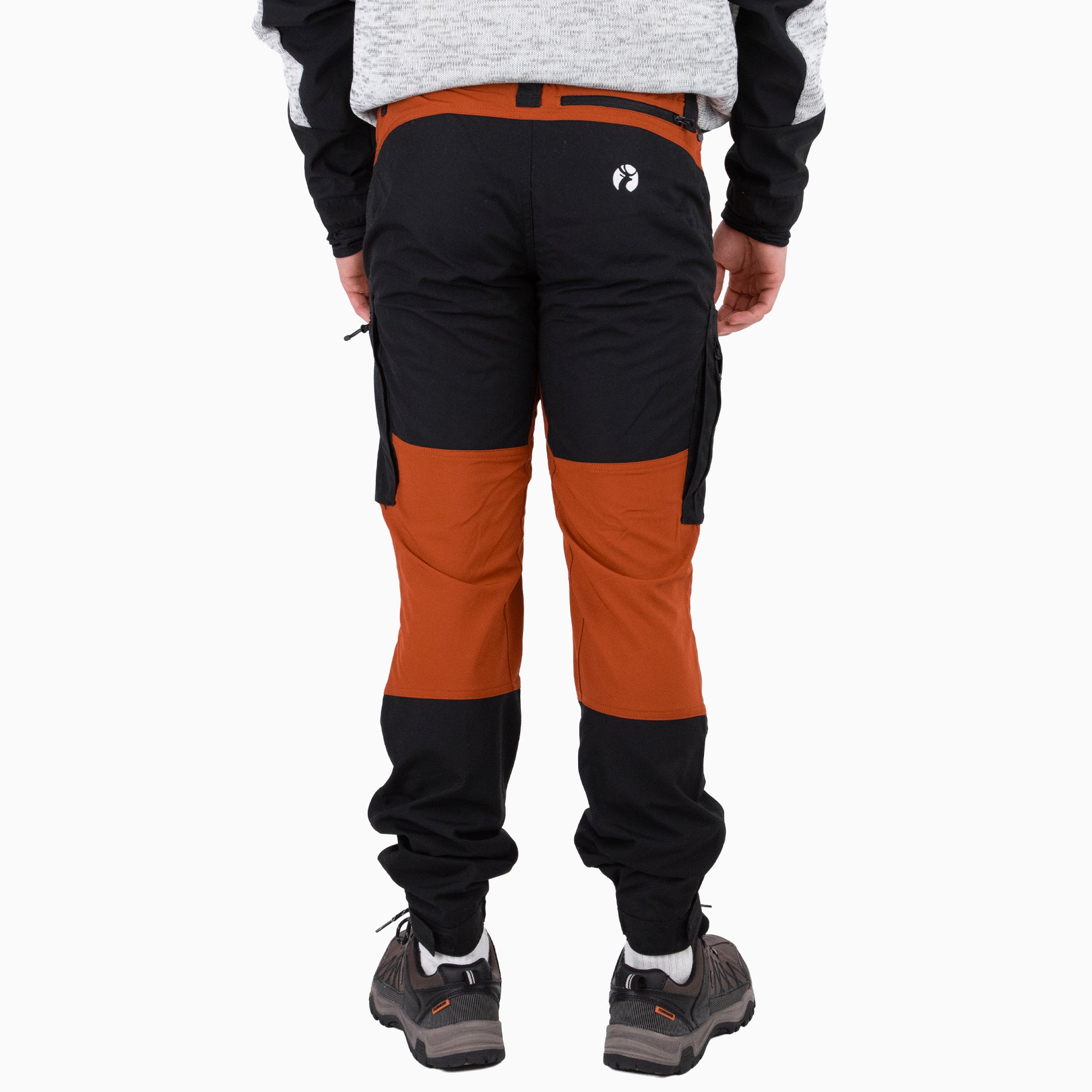 Pantalón de trekking moderno. Tejido resistente a viento y agua. Cintura elástica. Dos bolsillos delanteros, dos bolsillos con cremallera en la pierna y uno trasero. Refuerzos en las rodillas. Bajos ajustables con velcro.